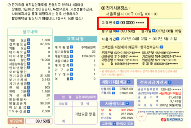 - 고객번호/계약번호/납부번호 등으로 표기되며 공급자마다 양식이 다름